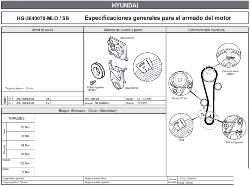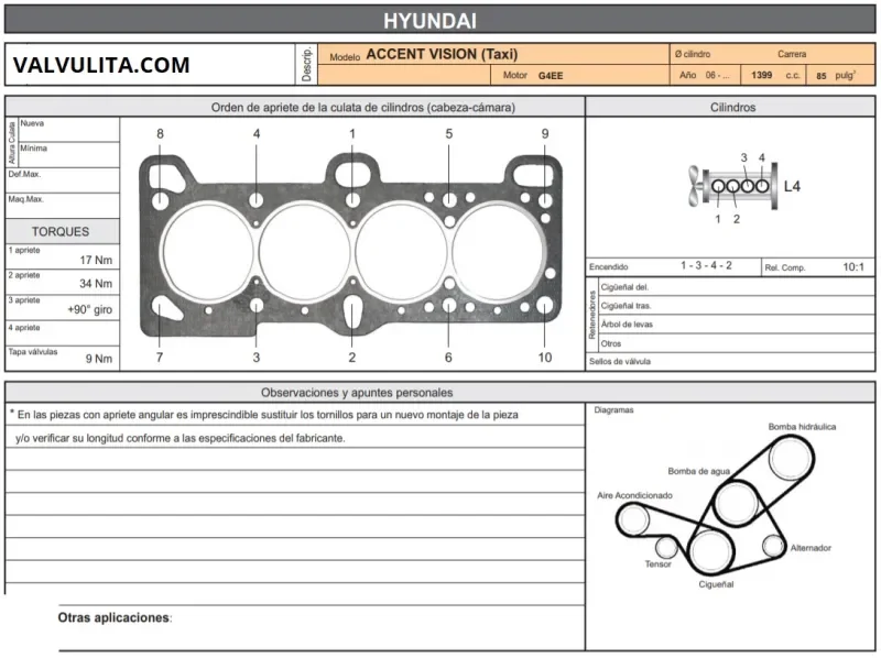 hola amigo, te dejo las especificaciones técnicas del motor Hyundai G4EE de tu Hyundai Accent. Allí está el torque de biela, torque de bancada, torque de culata. Saludos.