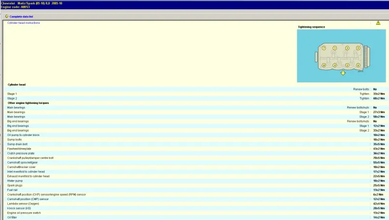 Hola Manuel, te comparto un diagrama con las especificaciones técnicas completas de torque o apriete para los elementos del motor A08S3 del Chevrolet Spark con motor de 0.8L. En dicho documento podrás encontrar la información de torque de biela, torque de bancada, torque de culata, entre otros.